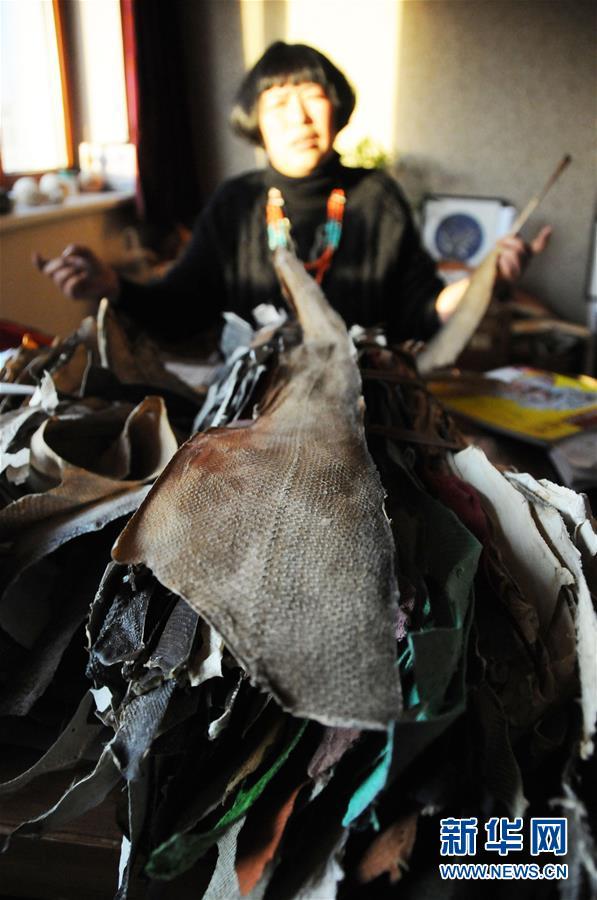 張琳的工作室堆滿(mǎn)了魚(yú)皮(2011年11月28日攝)。國(guó)家級(jí)非物質(zhì)文化遺產(chǎn)赫哲族魚(yú)皮制作技藝是我國(guó)赫哲族傳統(tǒng)手工藝術(shù)。作為這項(xiàng)技藝的黑龍江省級(jí)傳承人,十余年來(lái),張琳一直從事魚(yú)皮畫(huà)的研究和創(chuàng)作,并通過(guò)做推廣、開(kāi)講座、辦活動(dòng),讓更多年輕人了解并喜歡上這一傳統(tǒng)手工藝,將這項(xiàng)瀕臨失傳的藝術(shù)更好地傳承下去。新華社記者 王凱 攝