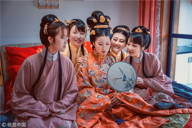 2018年11月18日,浙江嘉興。女孩黃聰今年30歲,是浙江省海寧市硤石人,是一位對漢文化情有獨(dú)鐘的個(gè)性女孩。對于這一次的漢婚大禮的每一個(gè)細(xì)節(jié),都非常仔細(xì)。小到發(fā)簪首飾,大到日常禮儀。說起為什么會舉辦這樣一場古風(fēng)婚禮,她說自己從2013年戀上漢服,就下了這個(gè)決定。