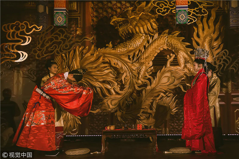 但最吸引參加婚禮的親朋好友眼球的,是整個(gè)婚禮現(xiàn)場富麗堂皇如皇宮一般。龍鳳呈祥,仿佛置身于古時(shí)皇宮大殿。圖為婚禮現(xiàn)場,具有古典風(fēng)味的合影。