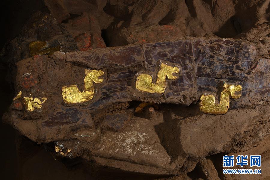 這是在位于河北行唐的考古實(shí)驗(yàn)室內(nèi)拍攝的局部車廂上鑲嵌有成組對(duì)稱的貼有金箔飾片的金屬質(zhì)獸型牌飾(12月4日攝)。新華社記者 李賀 攝