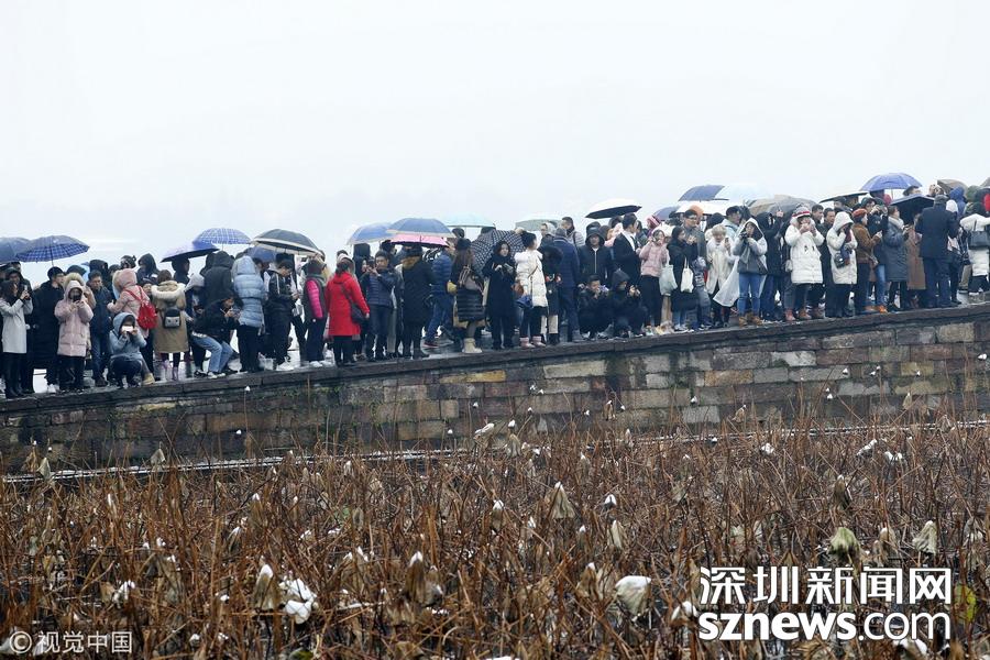 深圳新聞網(wǎng)訊 2018年12月8日,杭州,當(dāng)日市區(qū)普降大雪,市民和游客扎堆涌入西湖景區(qū),拍攝最美雪景照片以及為自己留影。每次杭州一下雪,斷橋便成為眾多游客欣賞雪景、拍攝雪景的地方,大家都想看看“斷橋殘雪”。游客們?cè)延咳霐鄻蚝?,人山人海,讓現(xiàn)場堪比春運(yùn)場景。因?yàn)槿颂?,雪積不起來,斷橋看不到殘雪。