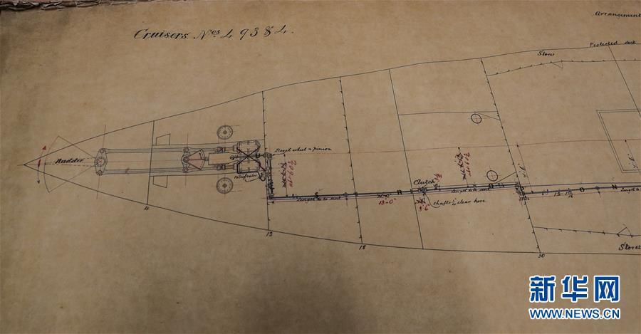 這是11月2日在英國紐卡斯爾的泰恩—威爾檔案館拍攝的致遠艦設(shè)計圖紙。 新華社記者日前在紐卡斯爾泰恩—威爾檔案館查找北洋海軍史料時發(fā)現(xiàn)一套七張、檔案名為“中國巡洋艦舵機設(shè)計圖”的原始圖紙。塵封百年,甲午海戰(zhàn)中抗擊日艦后沉沒的清北洋海軍致遠艦部分原廠設(shè)計圖紙在其建造地——英國紐卡斯爾市的一家檔案館首次被發(fā)現(xiàn),為打撈那段悲壯的歷史提供了重要參考。 新華社記者 韓巖 攝