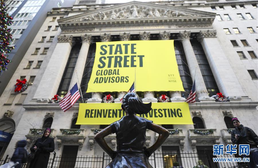 這是12月10日在美國紐約證券交易所前拍攝的“無畏女孩”銅像。 新華社記者 王迎 攝