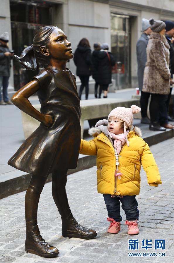 12月10日,在美國(guó)紐約,一名小女孩端詳紐約證券交易所前的“無(wú)畏女孩”銅像。 新華社記者 王迎 攝