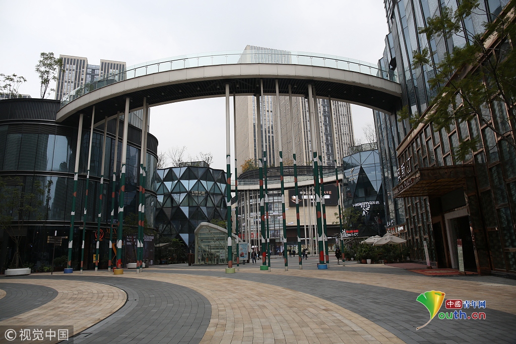 2017年3月16日,重慶,渝中區(qū)一棟大樓從22層架起兩座平行的天橋,連接對(duì)面的魁星樓廣場(chǎng)地面。圖片來源:視覺中國 |