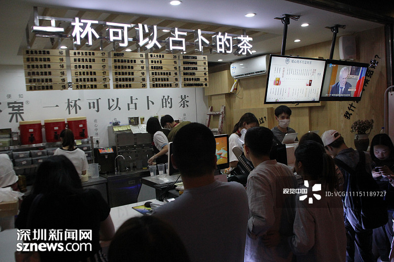 2018年4月21日,重慶,萬達(dá)廣場(chǎng)附近有一家新開業(yè)的網(wǎng)紅答案茶的冷飲店,這家答案茶冷飲店人氣異?;鸨T前已排起了兩條“長龍”。 |