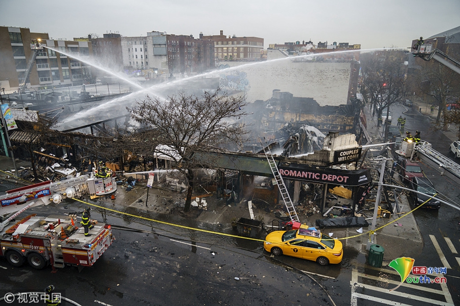 當地時間2018年12月13日,美國紐約,在紐約皇后區(qū)皇后大道,一場大火吞噬了六家商鋪。圖片作者:Drew Angerer