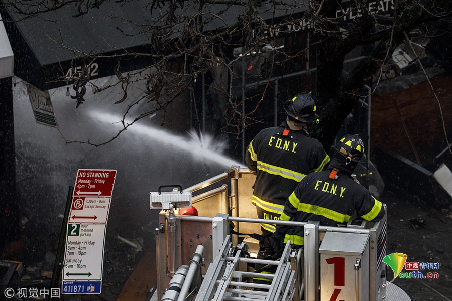 當地時間2018年12月13日,美國紐約,在紐約皇后區(qū)皇后大道,一場大火吞噬了六家商鋪,消防隊員正在努力撲滅火災余燼。十幾人受傷,包括6名消防員。起火原因仍在調查中。圖片作者:Drew Angerer