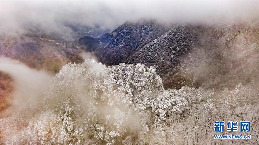 11月17日無人機拍攝的華山雪景。 當日凌晨的一場大雪將西岳華山變成白雪皚皚的世界,白雪與蒼翠的華山奇松、靈動的云海交相輝映,如夢如幻;滿山遍野玉樹瓊花,樹枝上通體的霧凇晶瑩剔透,繪就冬日畫境,美不勝收,游人如置身人間仙境。 新華社記者陶明攝