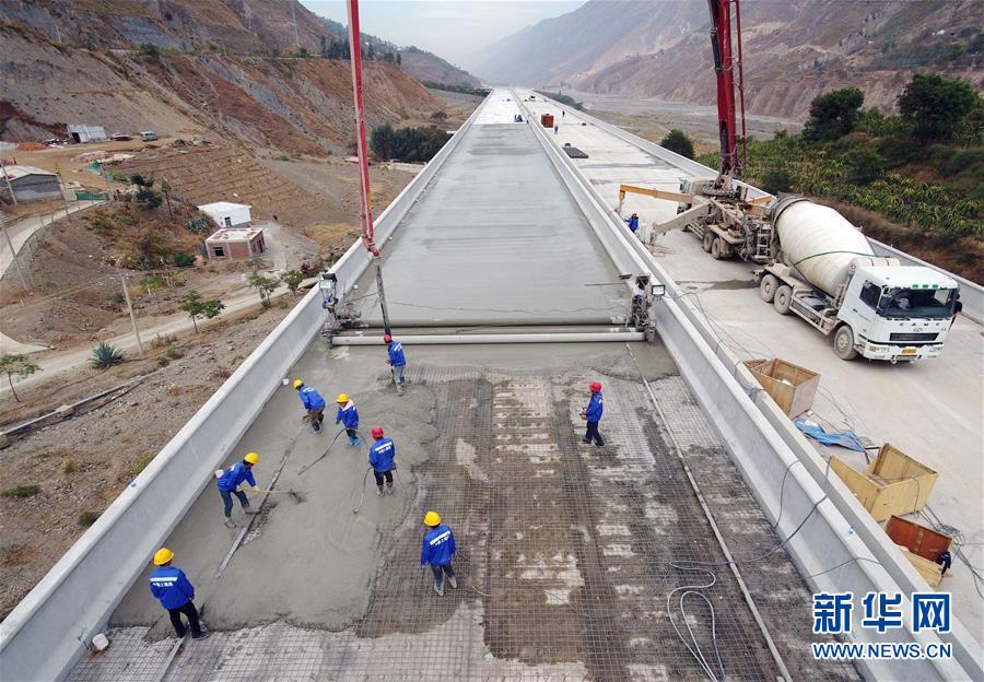 12月15日,中鐵上海局集團(tuán)公司的施工人員在東格高速公路土建項(xiàng)目中進(jìn)行橋面鋪裝作業(yè)。新華社記者楊宗友攝