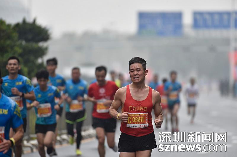 2018年12月16日,深圳國際馬拉松位于后海的折返點(diǎn),一名身著中國字樣背心的選手正向終點(diǎn)沖刺。