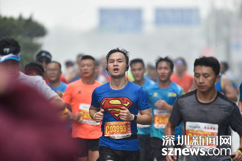 2018年12月16日,深圳國際馬拉松位于后海的折返點(diǎn),一名身著超人標(biāo)志短袖選手正在向終點(diǎn)沖刺。
