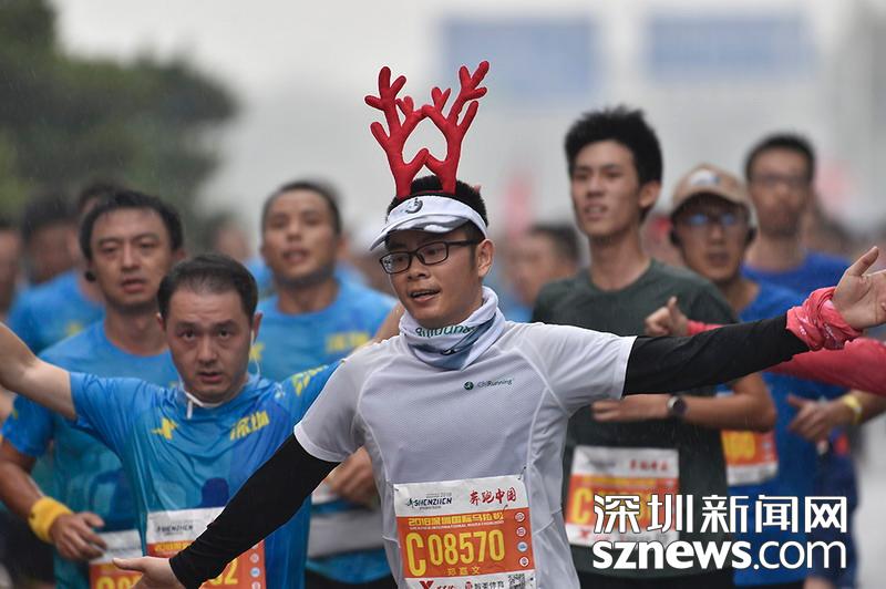 2018年12月16日,深圳國(guó)際馬拉松位于后海的折返點(diǎn),一名頭戴圣誕鹿角頭箍的選手正在向終點(diǎn)沖刺。