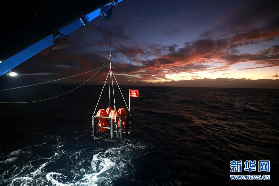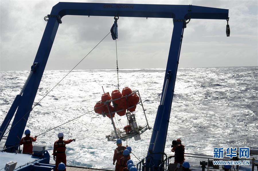 考察隊員在馬里亞納海溝“挑戰(zhàn)者深淵”海域布放“彩虹魚”著陸器(12月14日攝)。