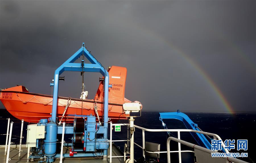 考察隊員在“沈括”號上回收“彩虹魚”著陸器(12月16日攝)。