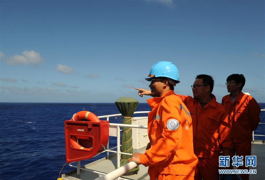 考察隊員在“沈括”號上布放“彩虹魚”著陸器(12月15日攝)。