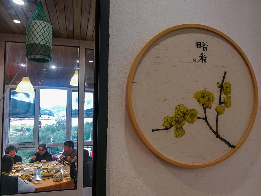 12月15日,客人在朱家尖烏石塘“漁夫客?!泵袼薨鼛麅扔貌?,該民宿有海景房7間,餐飲包廂8個。 新華社記者 徐昱 攝