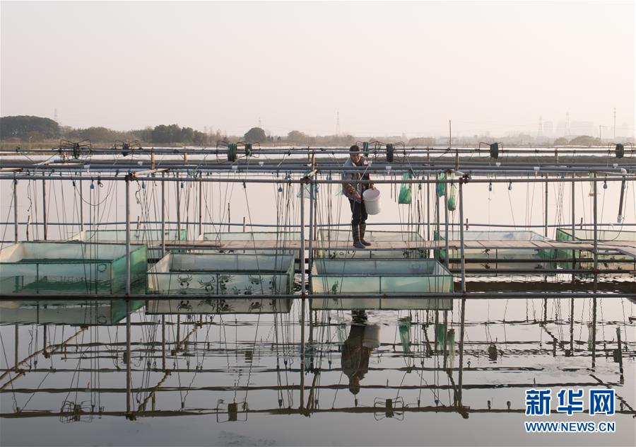 12月17日,在湖州市吳興區(qū)高新區(qū)廟港人千畝水產(chǎn)園,蟹農(nóng)給大閘蟹投喂玉米。 新華社記者翁忻旸攝