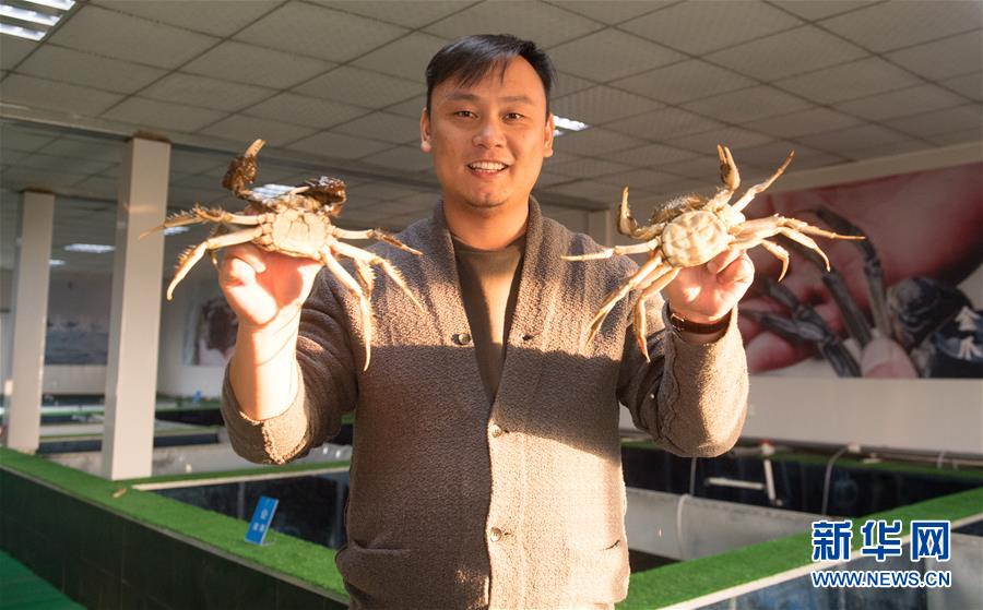 12月17日,在湖州市吳興區(qū)高新區(qū)廟港人千畝水產(chǎn)園,水產(chǎn)園負責人展示內(nèi)塘養(yǎng)殖的大閘蟹。 新華社記者翁忻旸攝