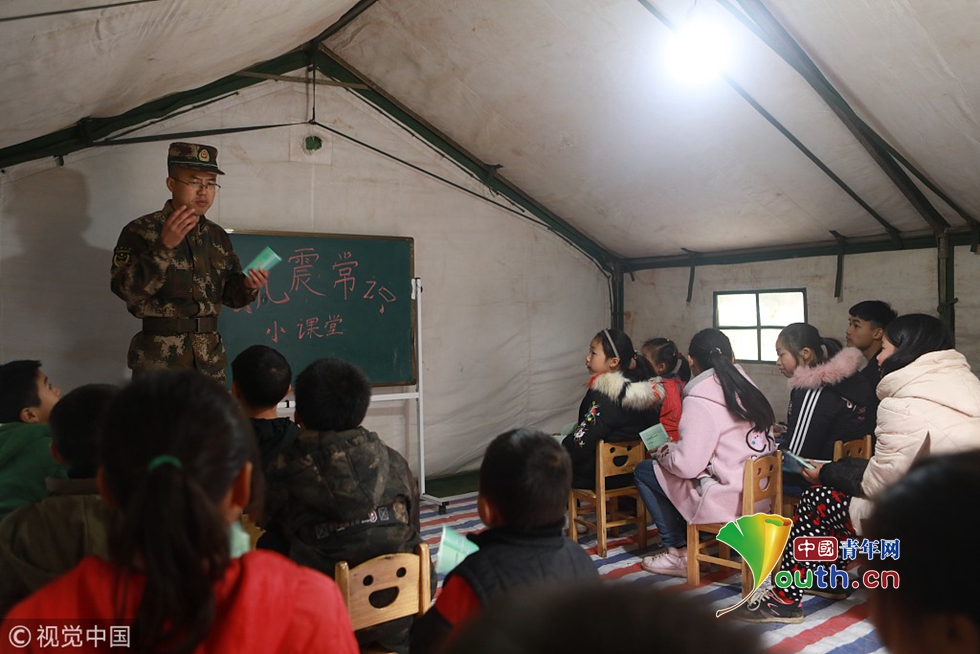 武警宜賓支隊(duì)政治工作處宣傳保衛(wèi)股股長朵祝偉為周家鎮(zhèn)新塘安置點(diǎn)的“帳篷學(xué)?!钡膶W(xué)生上抗震常識課。