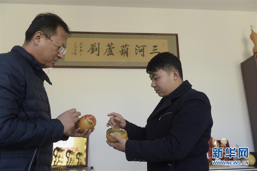 12月18日,劉征(右)在自己的加工坊里向來訪者介紹自己的葫蘆衍生品。 新華社記者 魯鵬 攝