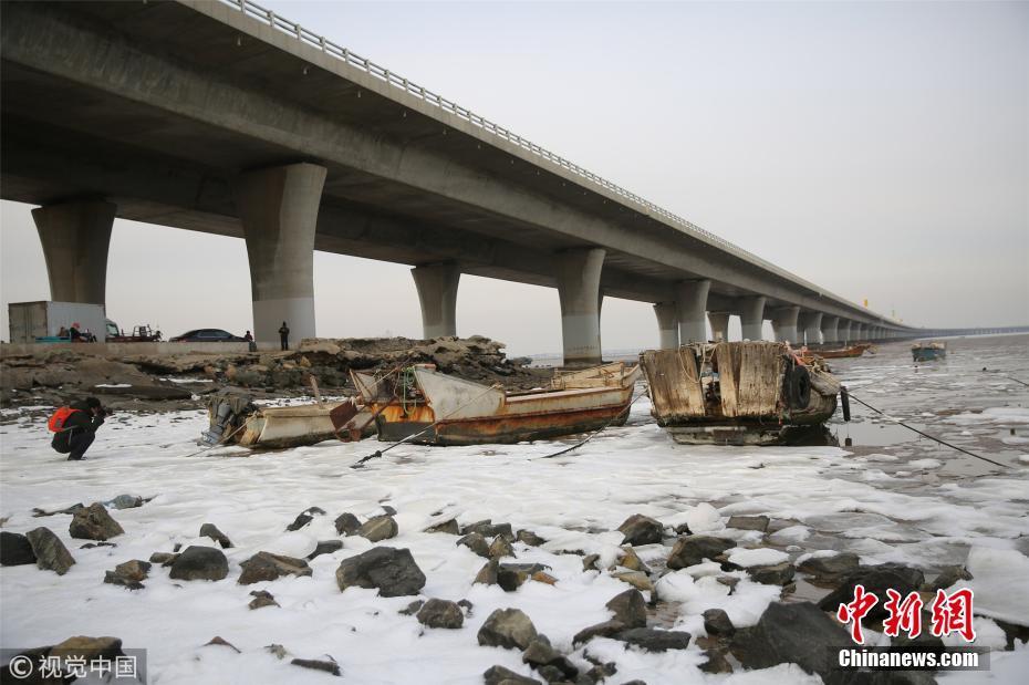 12月9日,受大風(fēng)降溫天氣影響,青島膠州灣北部冰情初現(xiàn),青島西海岸新區(qū)膠州灣跨海大橋入口處海冰層層疊疊,暫未對(duì)海上漁業(yè)生產(chǎn)帶來影響。張進(jìn)剛 攝 圖片來源:視覺中國