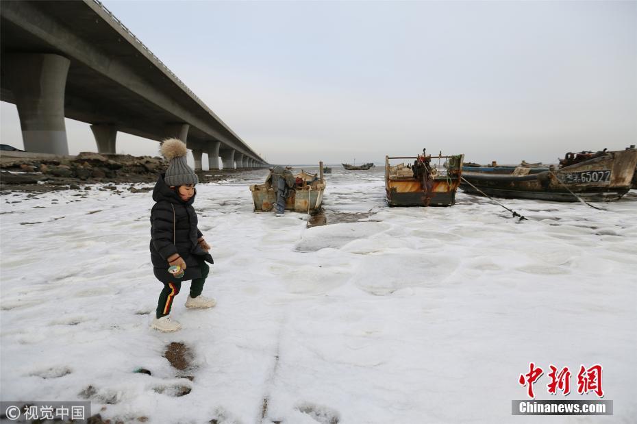 12月9日,受大風降溫天氣影響,青島膠州灣北部冰情初現,青島西海岸新區(qū)膠州灣跨海大橋入口處海冰層層疊疊,暫未對海上漁業(yè)生產帶來影響。張進剛 攝 圖片來源:視覺中國
