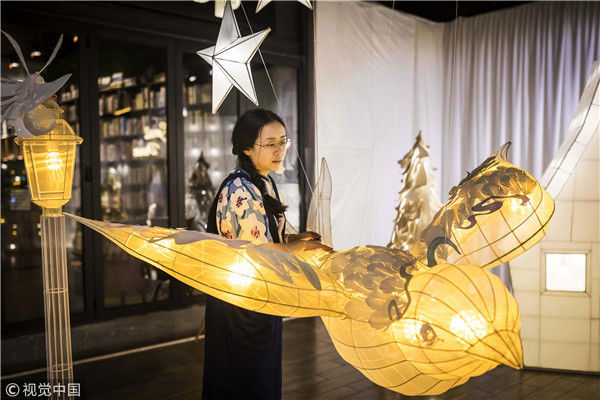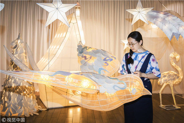 2018年5月6日,廣州,在天河區(qū)一家大商場(chǎng)辦個(gè)展時(shí),用紙片做成的北極熊、大松樹、火烈鳥、紙房子在光線的配合下美輪美奐,吸引了很多顧客駐足?!皫缀趺總€(gè)人一看到,都會(huì)走進(jìn)那個(gè)夢(mèng)幻的場(chǎng)景里,和這些紙雕一起合影?!眻D片攝于2018年5月6日。南塘/視覺中國(guó)