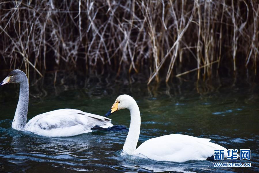 12月21日,兩只天鵝在黃河岸邊嬉戲。新華社記者吳剛攝