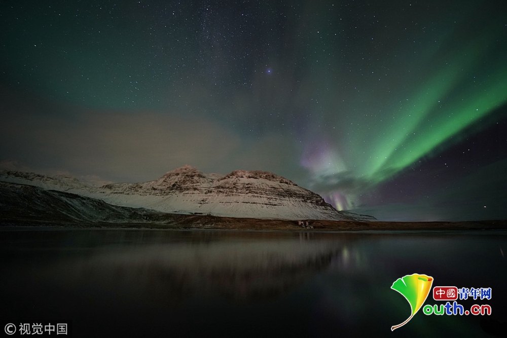 冰島湖泊山峰極光交相輝映宛如夢境