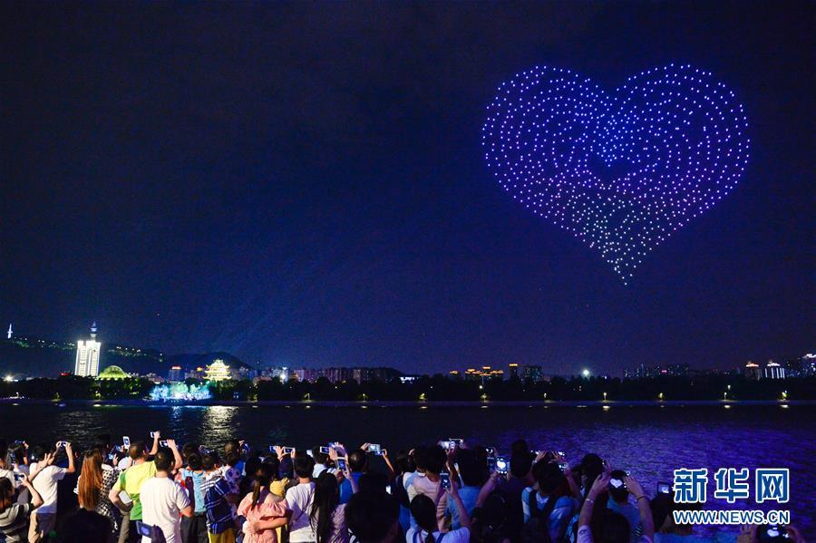 8月16日,無人機在湖南長沙橘子洲頭擺出愛心圖案。 在即將過去的2018年,各地攝影師用鏡頭記錄下四季中國。大江南北,一幅幅色彩斑斕的美麗畫卷徐徐展開。 新華社記者 張笑宇 攝