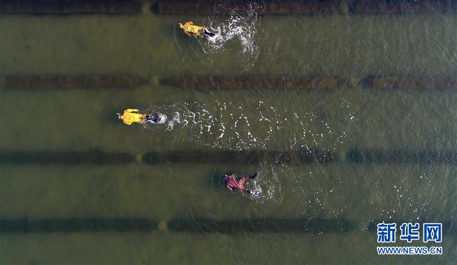 10月22日,樂亭縣姜各莊鎮(zhèn)二節(jié)村海參養(yǎng)殖基地的工人在捕撈海參(無人機(jī)拍攝)。 時下,正值渤海灣地區(qū)海參收獲時節(jié),河北省樂亭縣的海參養(yǎng)殖戶忙著捕撈海參,供應(yīng)各地市場。據(jù)介紹,該縣海域水質(zhì)優(yōu)良、氣候適宜,是海參養(yǎng)殖的理想場地,目前發(fā)展池塘造礁養(yǎng)殖海參面積6萬畝,年產(chǎn)鮮活海參6000多噸,年產(chǎn)值2億多元。  新華社記者 楊世堯 攝
