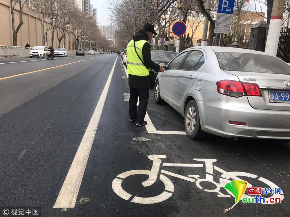 現(xiàn)場(chǎng),文化宮路與友愛(ài)路口附近,新鋪好的路面被劃上了嶄新的行車線和停車位標(biāo)線。從文化宮路和友愛(ài)路交叉口向北,道路東側(cè)的非機(jī)動(dòng)車道被停車位占去后,僅剩下0.8米左右的寬度。同樣在路口南側(cè),道路西側(cè)的非機(jī)動(dòng)車道也被新劃的停車位占去,僅剩不足1米的寬度。