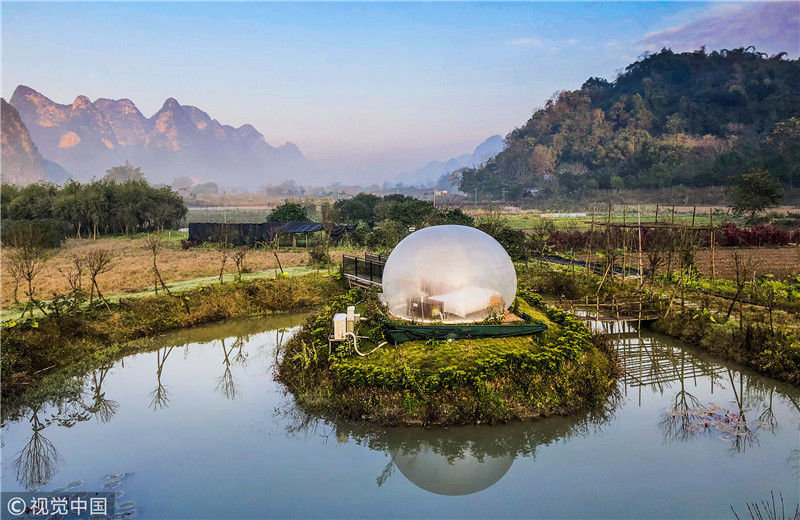 最近這幾年,中國的民宿風(fēng)越刮越猛,各地精品民宿紛紛如雨后春筍一樣冒出了,而且他們用其更獨(dú)特的設(shè)計(jì)感吸引著人們的目光。其實(shí)對比星級(jí)酒店,民宿最大的優(yōu)勢,就是設(shè)計(jì)風(fēng)格更獨(dú)特,更具藝術(shù)感,也更符合人們的審美要求,同時(shí)又能做到比星級(jí)酒店更舒適,更適合度假,所以大家現(xiàn)在出行都更熱衷于選擇民宿。圖為2018年12月18日,廣西桂林,陽朔縣遇龍河畔。晨光中的泡泡屋。棋簿紫/視覺中國