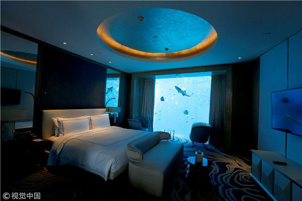 2018年4月25日,海南三亞,亞特蘭蒂斯酒店的海王星水下套房,魚(yú)在窗外游泳。