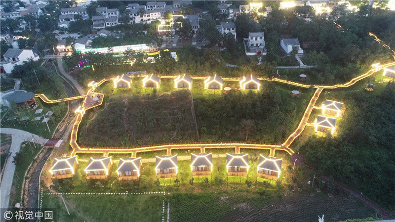 2018年7月6日,航拍陜西渭南臨渭區(qū)天留山下的小木屋民俗酒店。王警/視覺(jué)中國(guó)