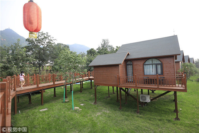 2018年7月6日,航拍陜西渭南臨渭區(qū)天留山下的小木屋民俗酒店。王警/視覺中國