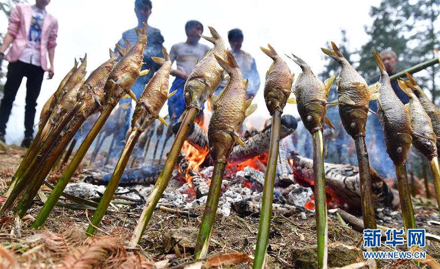 2018年春節(jié)期間,村民在田邊燒魚(2月24日攝)。