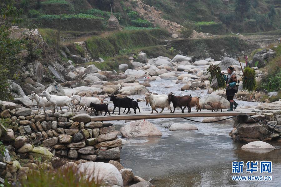 勞作歸來的村民潘妹迫趕著羊群過河(2017年11月10日攝)。