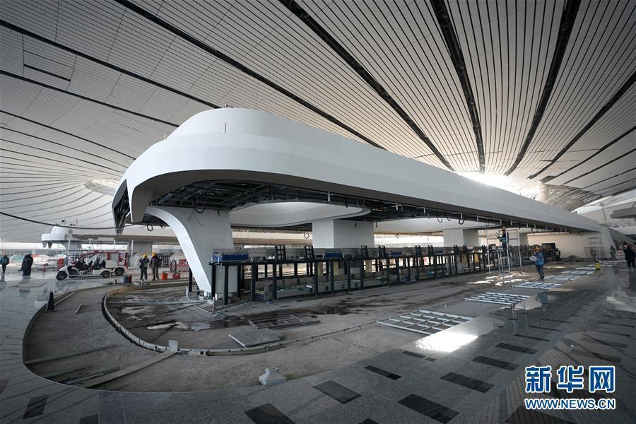 在北京大興國際機(jī)場主航站樓內(nèi),施工人員在進(jìn)行裝飾裝修工作。新華社記者 鞠煥宗 攝 圖片來源:新華網(wǎng)