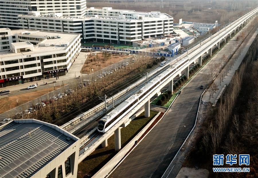這是2018年12月29日無(wú)人機(jī)拍攝的車(chē)輛通過(guò)濟(jì)南軌道交通1號(hào)線創(chuàng)新谷站。新華社記者朱崢攝