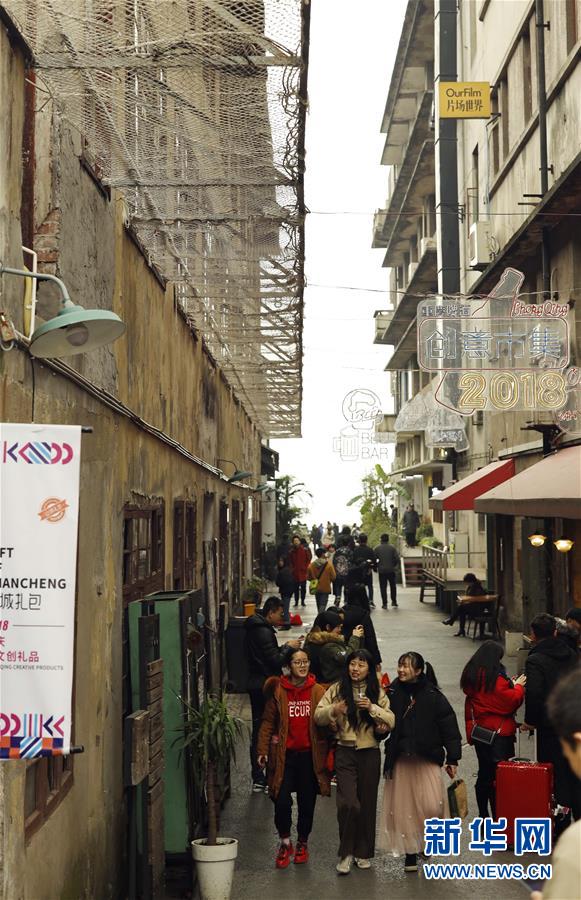 1月1日,游客們?cè)谥貞c鵝嶺二廠文藝街區(qū)內(nèi)游覽。