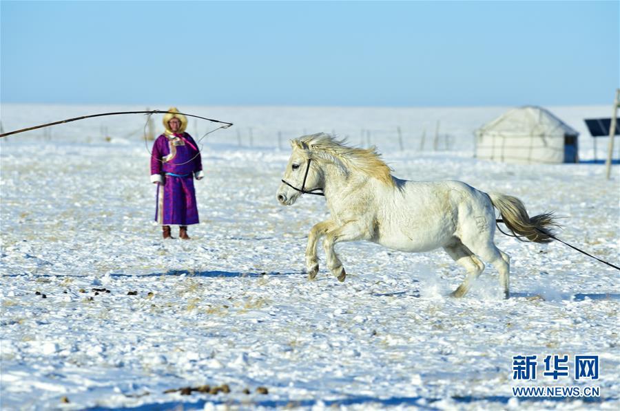 1月8日,牧民進(jìn)行套馬表演。 時(shí)下正值草原冬季旅游旺季,內(nèi)蒙古自治區(qū)西烏珠穆沁旗的牧民們在雪原上一展身手,為游客展現(xiàn)獨(dú)特的民族風(fēng)情。 新華社記者 鄒予 攝