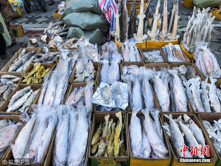 1月12日,黑龍江省佳木斯市撫遠(yuǎn)東極魚市,撫遠(yuǎn)東極魚市的凍魚。棋簿紫 攝 圖片來(lái)源:視覺(jué)中國(guó)