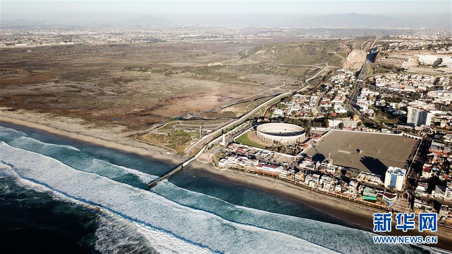 這是1月10日在墨西哥邊境城市蒂華納航拍的美墨邊境墻。畫面左側為美國,畫面右側為墨西哥。 新華社記者 辛悅衛(wèi) 攝