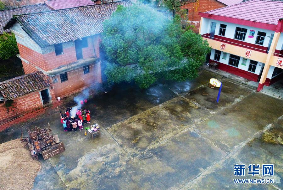 1月3日,章站亮和學生們一起在學校內燒飯(無人機拍攝)。 新華社記者 胡晨歡 攝