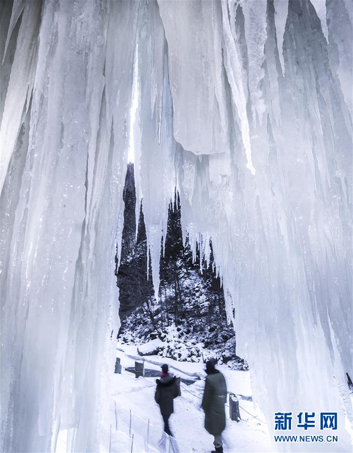 1月12日,游客在涉縣太行五指山景區(qū)觀賞冰瀑。新華社記者王曉攝