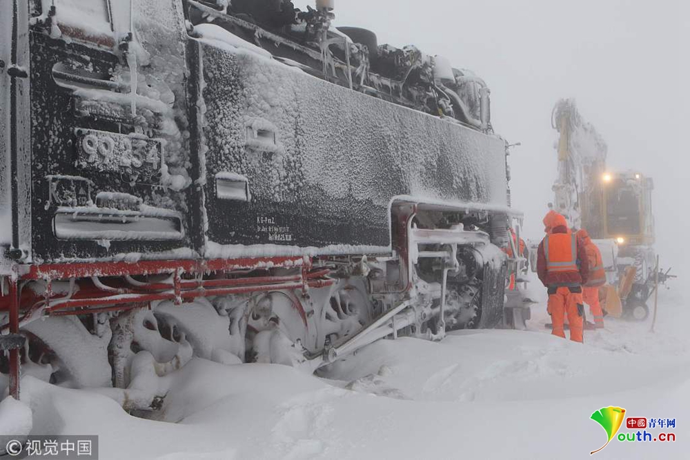 當(dāng)?shù)貢r(shí)間2019年1月9日,德國(guó)錫爾克,一輛蒸汽火車被大雪困住無(wú)法前進(jìn)。