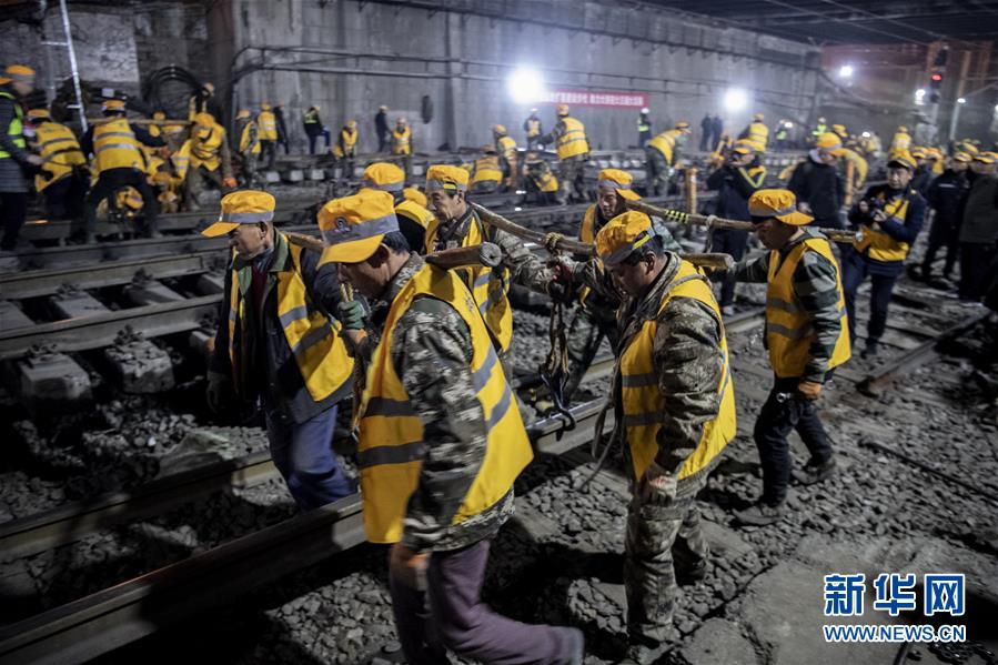 1月15日凌晨,中鐵十一局施工人員在西安站改現(xiàn)場(chǎng)抬運(yùn)鋼軌。新華社記者陶明攝
