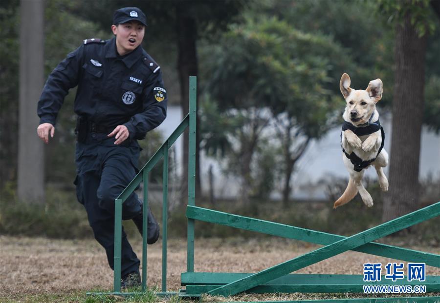 1月15日,警犬“皮特”在訓(xùn)導(dǎo)員丁巖的帶領(lǐng)下進(jìn)行崗前特訓(xùn)。新華社記者 程敏 攝